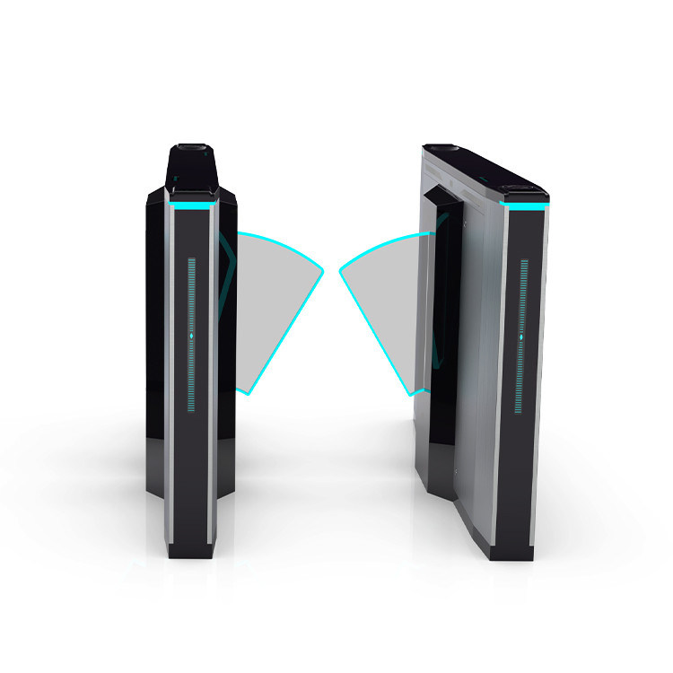 4. La puerta del torniquete de la barrera de la aleta tiene una alarma audible y visual. Cuando la puerta está en el estado espera, el LED es azul; cuando la gente pasa a través de la puerta, es verde; y cuando la gente intenta incorporar el paso de la puerta sin el permiso, el LED da vuelta rojo y el zumbador en las señales sonoras de la puerta para alertar a gente a la violación de la autorización.